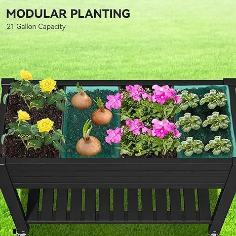 EFFORTLESS GARDENING- This elevated garden bed has 4 universal wheels, 2 of which are equipped with brakes to increase stability and mobility; The bottom shelf provides sufficient storage space for tools and flowerpots; 3 rubber strips can make 4 grids to plant different vegetables or herbs