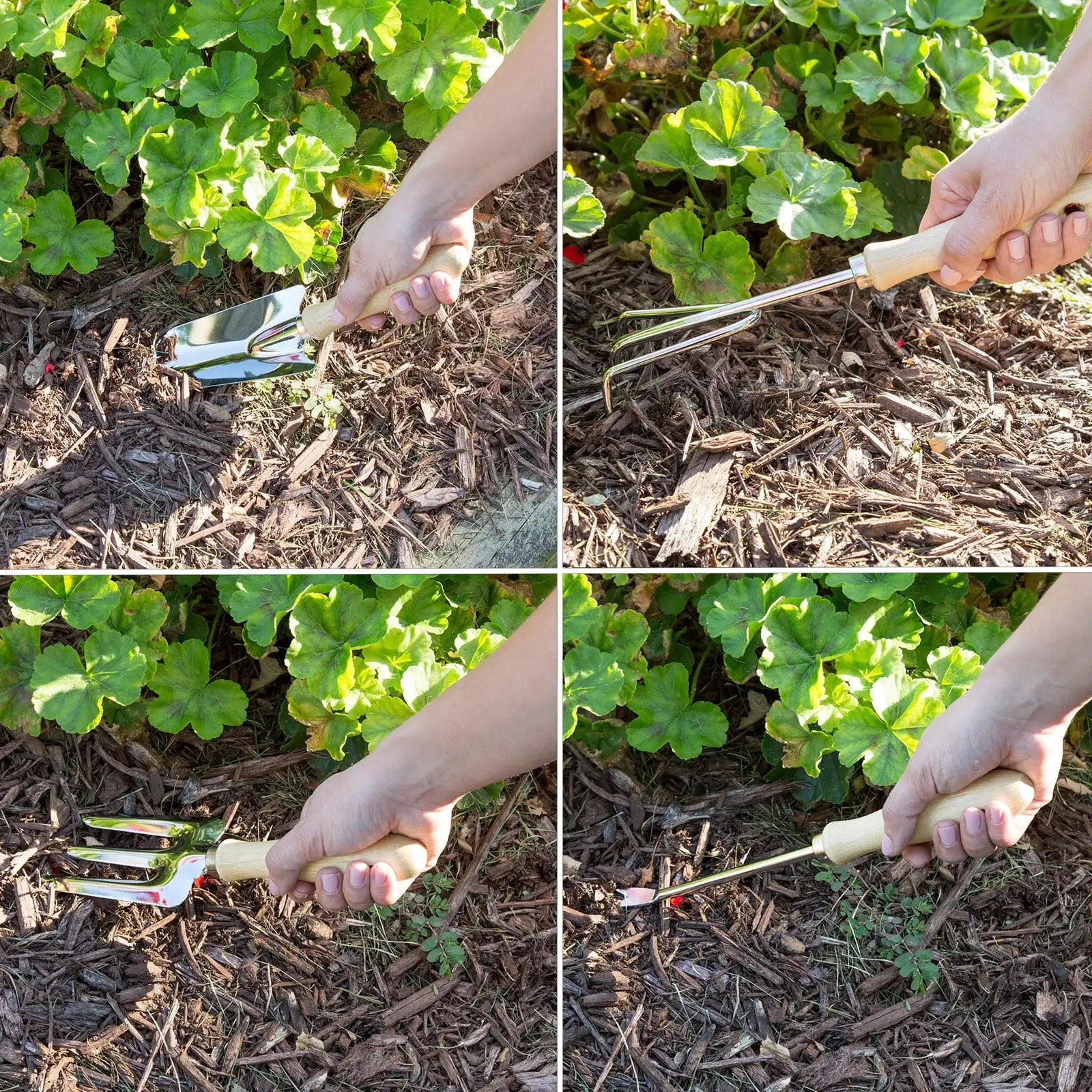 Set of garden tools with weeder, fork, transplanter, cultivator, and trowel